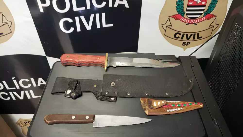 Os policiais procuraram pelo suspeito e ele foi encontrado e detido à força. Facas foram apreendidas.
